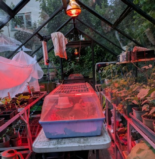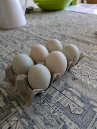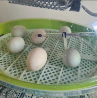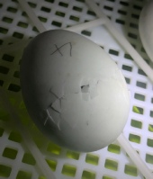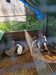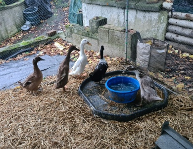 We ordered six Indian Runner duck eggs through eBay and they arrived safely in the post. They were popped in our incubator and after four weeks showed signs of hatching, which they all did within twenty four hours. We kept the ducklings in a heated ‘nursery’ (a bit like a plant propagator) in our kitchen for about ten days till they got too big (… and too smelly!) before moving them out to the greenhouse to grow on. They spent their daytimes in one of the raised vegetable beds in the front garden and enjoyed a regular swim. Later they moved on to a separate pen next to our three older ducks on the lower terrace whilst the new run was being constructed at the bottom of the garden.